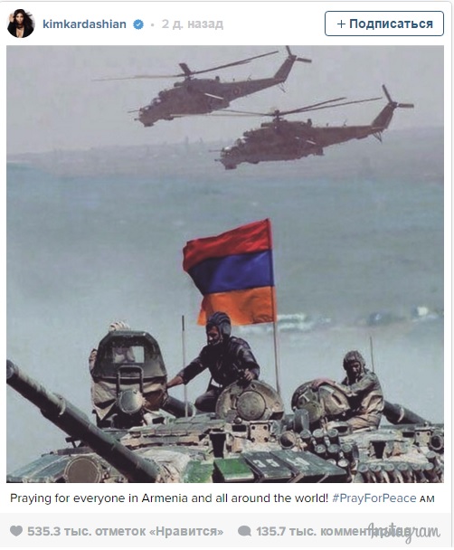 Отметим, 5 апреля Ким Кардашьян опубликовала в Instagram пост со словами поддержки Армении на фоне  карабахского конфликта. Сообщение собрало около 500 тысяч лайков и более 130 тысяч комментариев. Стоит отметить, что значительная часть обсуждения состояла из перепалки азербайджанцев и армян.