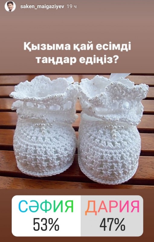 "Ал құрметті халайық, Сәкен екеуміз ақылдаса отырып, қызымызға Сафия деген ат қояйық деп отырмыз. Бақытты қыз болсын, саф алтындай әдемі, сұлу, қазақтың алтын қызы болсын, бауы берік болсын!", - деді Мақпал Жүнісова.
