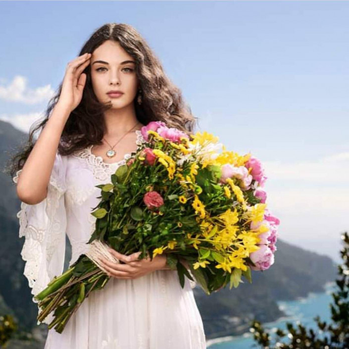 На фото Дева позирует в белоснежном кружевном платье на фоне Амальфийского побережья.