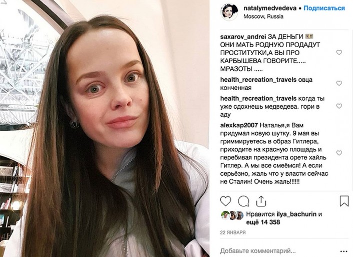 В настоящее время в Сети идет "зачистка", ролики с записью шутки о Карбышеве удаляют, блокируют с формулировкой о нарушении авторских прав. А в Instagram Наталии Медведевой (именно она произнесла злополучные слова о генерале. - Прим.) устроили жесткую травлю актрисы. Люди напоминают исторические факты об убийстве Дмитрия Карбышева и требуют извинений.