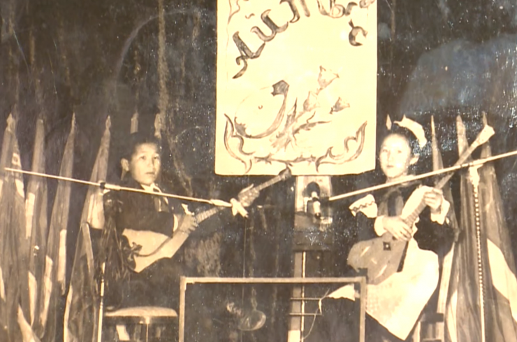 Суретте қос ішекті домбыраны шертіп, өнер көрсетіп отырған қыз әнші Гүлнұр Оразымбетова. Ол алғаш ән айтуды 5 жасында бастаған екен.