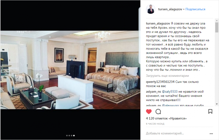 "Я совсем не держу зла на тебя Арсен, хочу чтобы ты знал про это и не думал по другому, надеюсь придет время и ты осознаешь свой поступок , как бы ты его не переживал на тот момент, я все равно буду любить и помогать тебе в какой бы ты не оказался жизненной ситуации, ведь это всего лишь квартира, которую можно купить или обменять, а с совестью и честью так не поступить, хочу что бы ты помнил и знал это", - написал в посте Алагузов (орфография и пунктуация автора в основном сохранены - прим.).