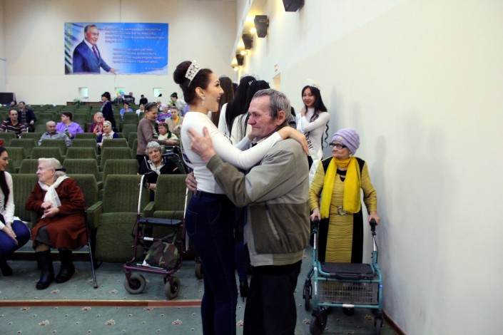 Участницы национального конкурса "Мисс Казахстан-2015" посетили КГУ "Медико-социальное учреждение для престарелых и инвалидов" в Астане, сообщает корреспондент Tengrinews.kz.