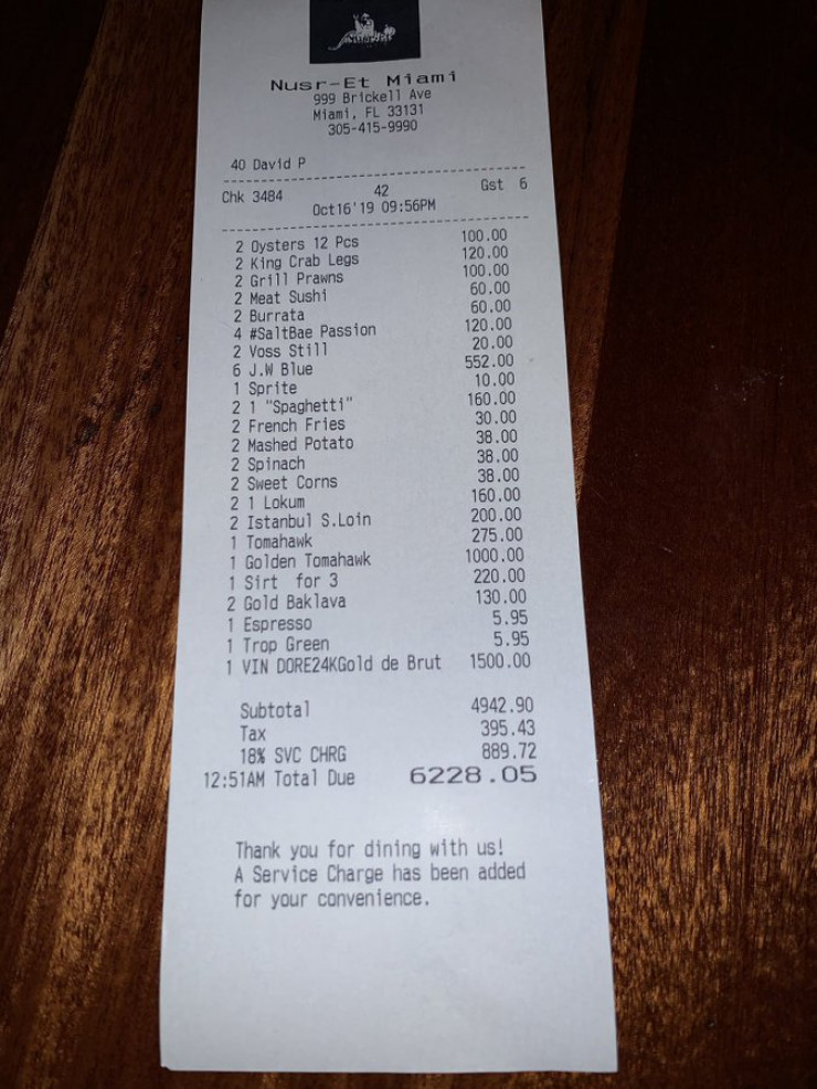 Посетитель ресторана Salt Bae's, основателем которого является знаменитый турок Нусрет Гекче, выложил в Сеть счет за ужин в заведении. Цены шокировали пользователей, передает Tengrinews.kz со ссылкой на LADbible.