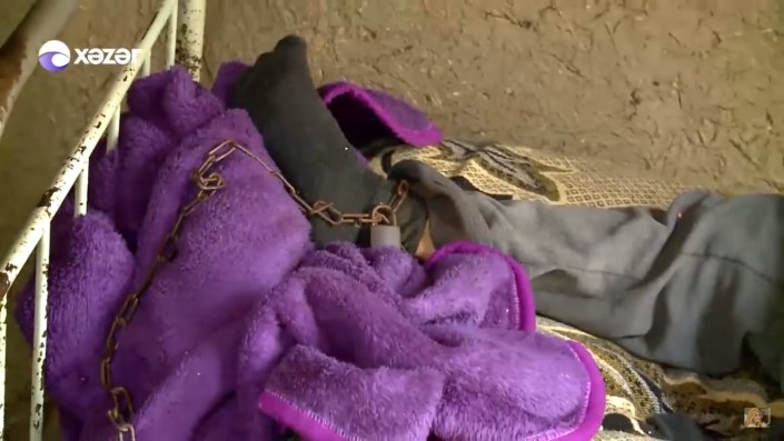 В одном из населенных пунктов Азербайджана местная жительница 20 лет держит родного сына на цепи в хлеву. Шокирующие кадры показали в анонсе передачи "Səni axtarıram" ("Ищу тебя") на телеканале Xəzər.