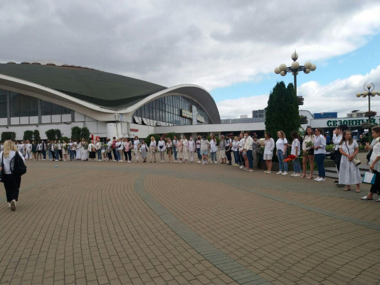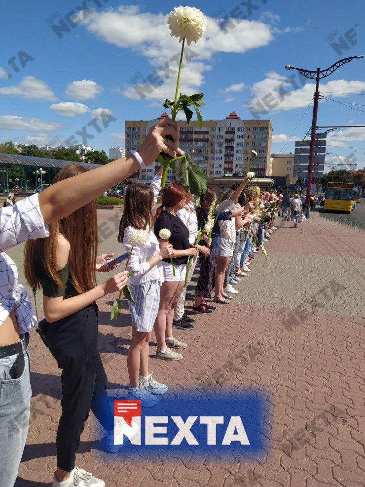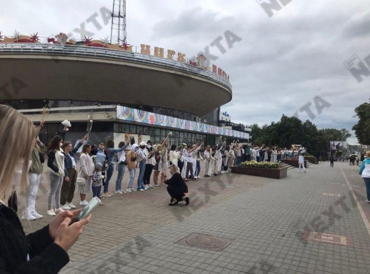 По данным РИА Новости, "цепь солидарности" из нескольких десятков человек выстроилась вдоль проспекта Независимости в спальном микрорайоне Уручье на востоке Минска. У многих из участников белые элементы одежды, люди держат в руках цветы и размахивают ими. Среди участников много женщин. Они также выложили цветы на обочину проспекта.
