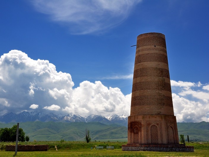 "Древних памятников в стране ровно два: маленькая башня Бурана под Токмаком и скромный архитектурный комплекс в Узгене. Есть еще, правда, несколько старинных мечетей, но они не очень выразительны и сильно подновлены реставраторами.