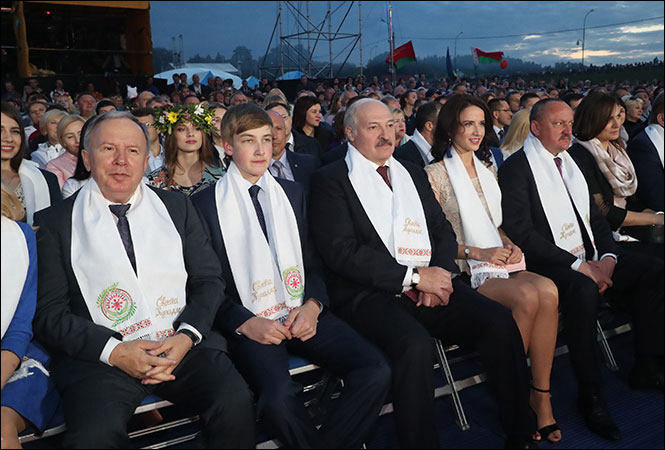 Снимок сделан во время республиканского праздника "Купалье". Справа от Лукашенко сидел его младший сын Коля, а слева - молодая брюнетка.