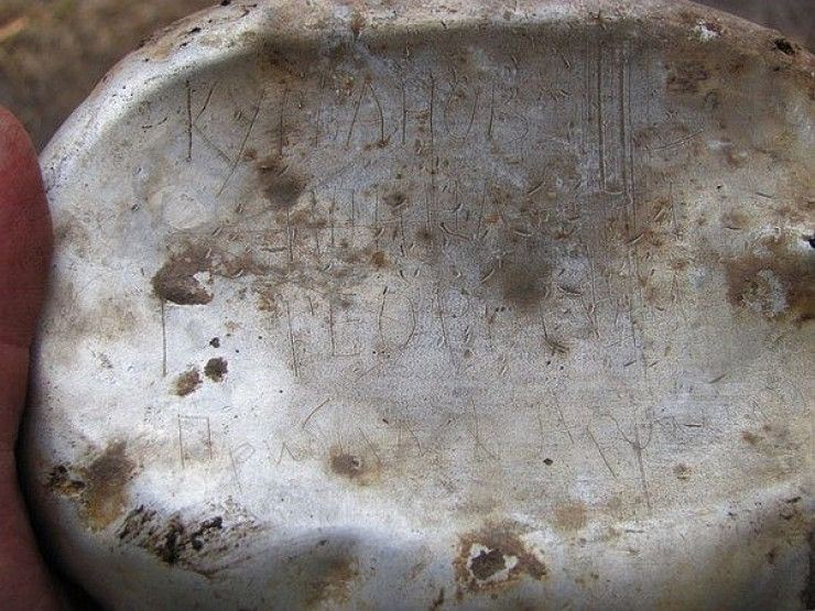 Находку с надписью "Курбанов Геннадий Георгиевич 1914 гр. Казахская ССР Павлодарский край. Призван в армию в 1940 году" обнаружили в блиндаже на Квадратной Поляне в районе Гайтолово.