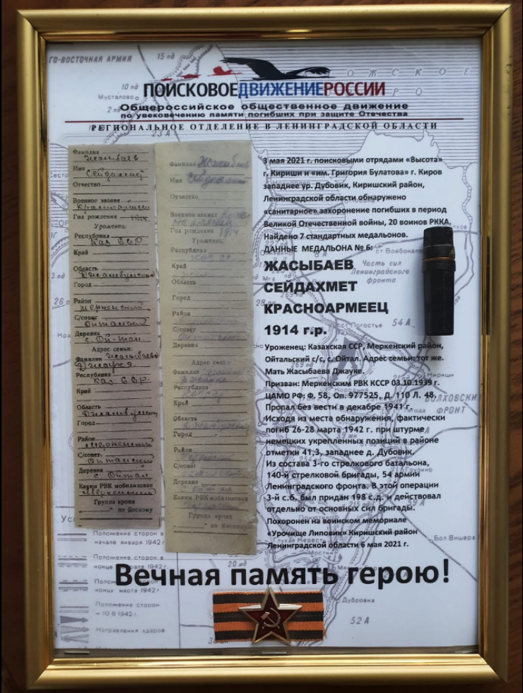 Братскую могилу с останками 20 воинов, среди которых оказался Сейдахмет Жасыбаев, поисковики кировского отряда имени Григория Булатова и бойцы киришского отряда "Высота" нашли во время раскопок в районе деревни Дубовик Киришского района Ленинградской области.