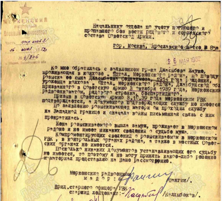 После войны жена бойца вышла замуж, а его мать Джауке Жасыбаева продолжала ждать и искать. По архивным данным, последний официальный запрос по поиску без вести пропавшего сына она отправила в мае 1952 года в Меркенский райвоенкомат, а оттуда в Москву в отдел по учету погибших и пропавших без вести советских воинов. Женщина сообщала, что сын с 1939 года служил на западной границе. Последнее письмо от него она получила незадолго до июня 1941 года. На этом письменная связь прекратилась.