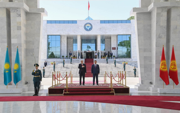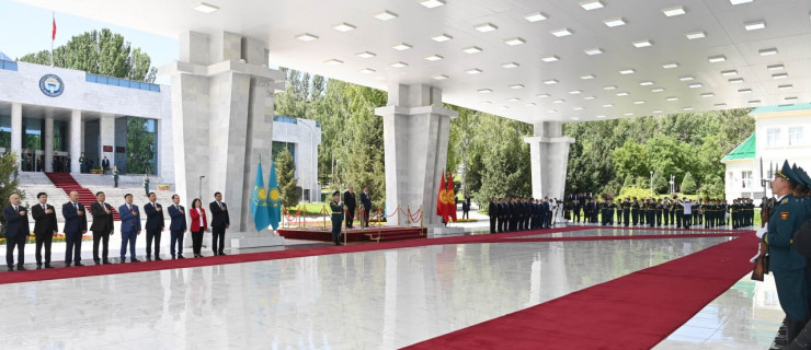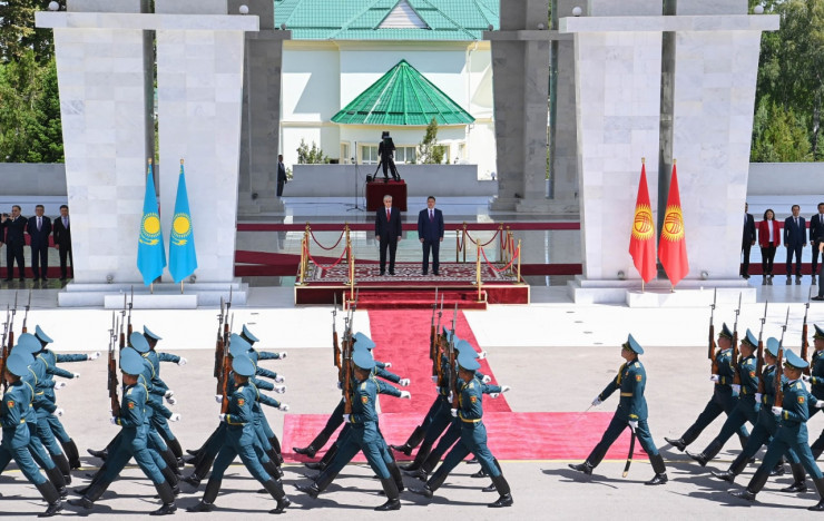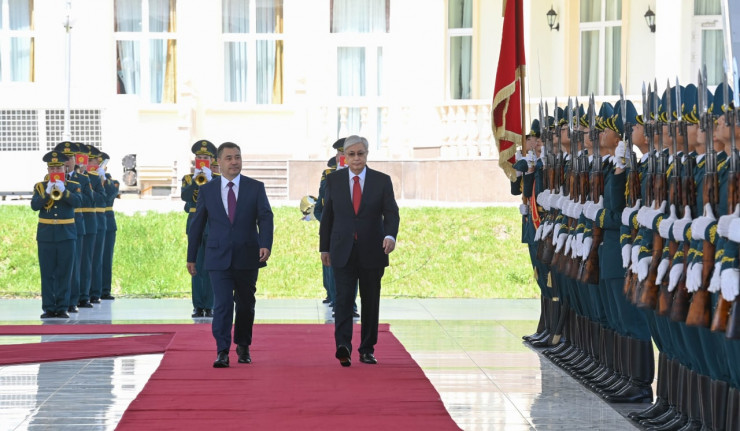 Начальник почетного караула отдал рапорт лидерам двух стран. После исполнения гимнов Казахстана и Кыргызстана Касым-Жомарт Токаев и Садыр Жапаров представили друг другу членов официальных делегаций.