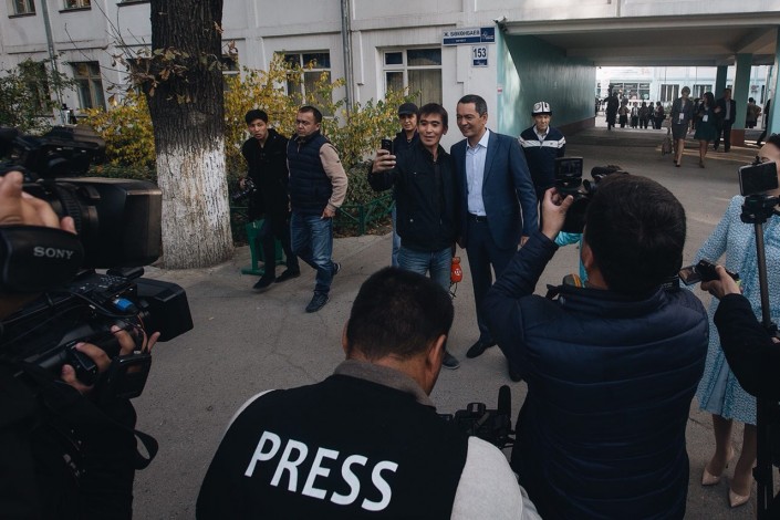 Омурбек Бабанов фотографируется с журналистом из Казахстана. Фото Tengrinews.kz
