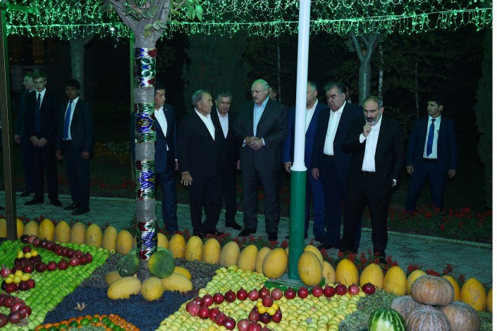 Главы государств вышли на вечернюю прогулку и ознакомились с выставкой природных даров Таджикистана.