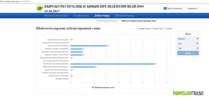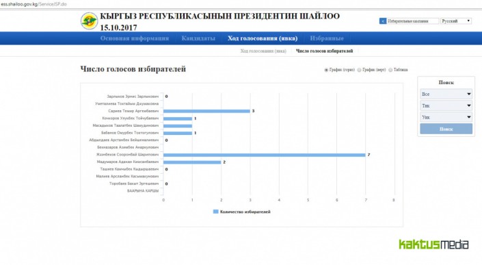 Судя по графику, больше всего голосов (семь) набрал Сооронбай Жээнбеков, далее идут Темир Сариев (три), Адахан Мадумаров (два), Омурбек Бабанов (один) и другие.
