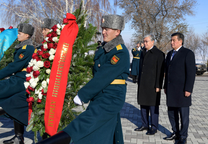 Токаев, прибывший с государственным визитом в Кыргызстан, в сопровождении президента Сооронбая Жээнбекова посетил Национальный историко-мемориальный комплекс "Ата-Бейит" в Бишкеке.