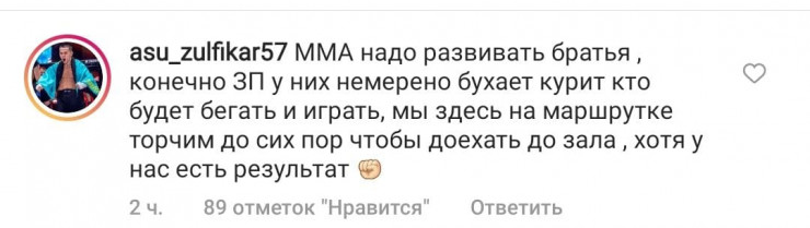 "ММА надо развивать, братья. Конечно, ЗП у них немерено. Бухают, курят. Кто будет бегать и играть. Мы здесь на маршрутке торчим до сих пор, чтобы доехать до зала, хотя у нас есть результат", - написал Алмабаев.
