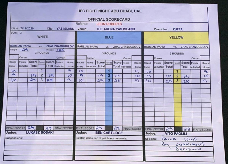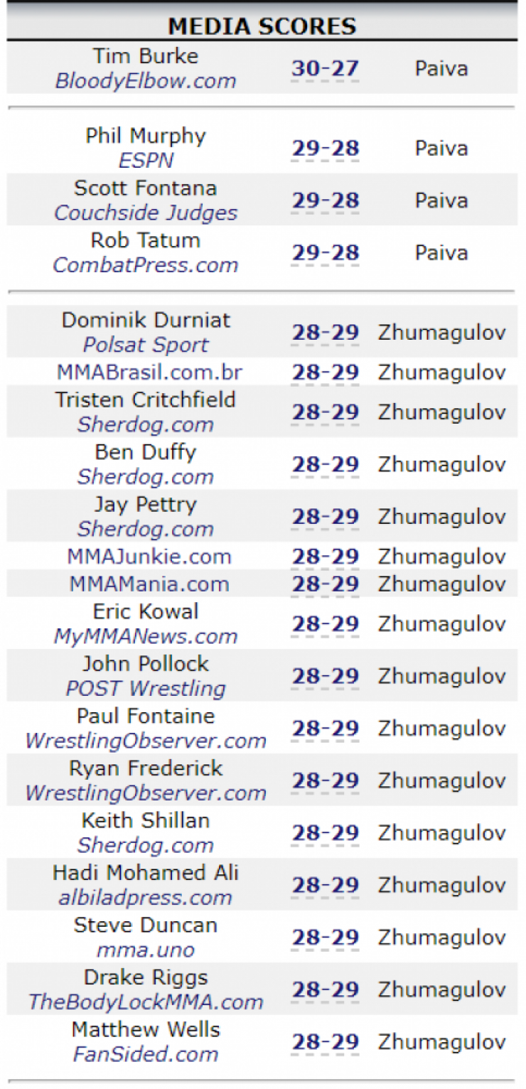 Все трое судей выставили одинаковый общий счет - 28-29 в пользу Пайвы, а также отдали Жумагулову лишь второй раунд.