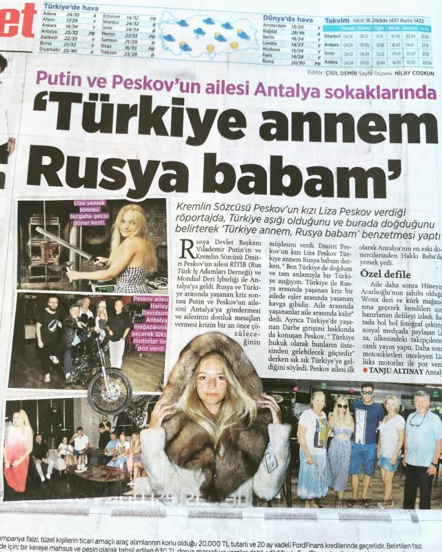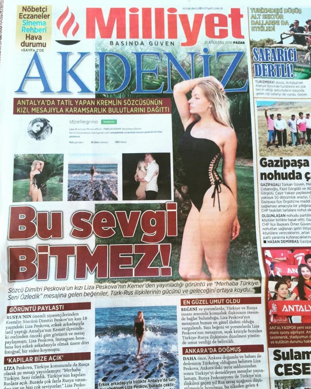 18-летняя дочь пресс-секретаря президента России Дмитрия Пескова Лиза оказалась на первых полосах турецких газет. Фотографии обложек турецких газет опубликовала у себя в Instagram мама Лизы - бывшая жена Пескова Екатерина.