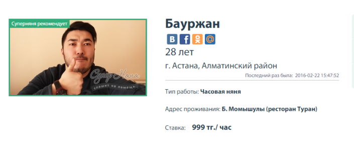 В анкете у него указано, что этот бебиситтер может оказывать свои услуги во вторник, среду и четверг. "Могу подышать свежим воздухом с вашим малышом на горках или просто погулять во дворе. Научу детей публичному выступлению, игре в шахматы, большому теннису, ведению бизнеса. Веселое времяпровождение ребенку обеспечено", - написал о себе Бауржан Канкин.