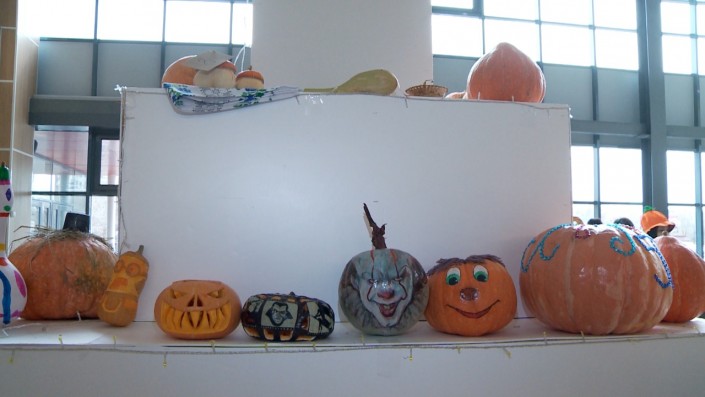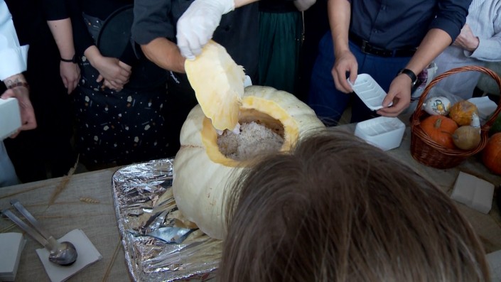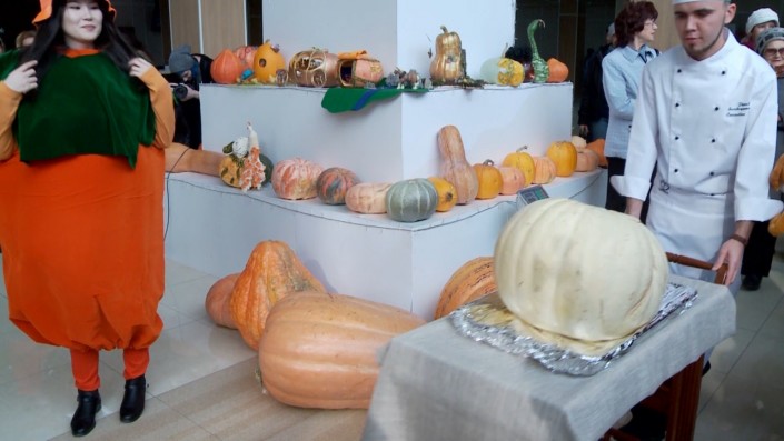 Помимо размеров тыкв, организаторы удивили гостей тыквой-казаном, внутри которой повар приготовил плов, тыквами необычных форм и поделками из этого овоща.