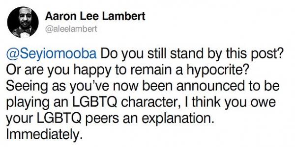 "Сейи Омуба, ты по-прежнему так считаешь? Счастлива ли ты быть святошей и лицемеркой? После того как ты объявила, что будешь играть ЛГБТК-персонажа, я думаю, ты должна объясниться перед своими ЛГБТК-коллегами. Немедленно", - написал он.