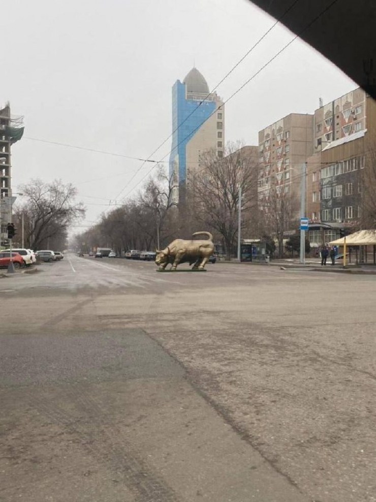 Алматының Әуезов пен Төле би көшелерінің қиылысындағы бұқа инсталляциясы. © Әлеуметтік желілерде таралған сурет