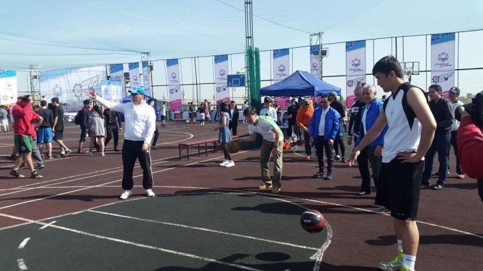 Бауыржан Байбек продемонстрировал спортивные навыки по стритболу Фото предоставлено пресс-службой акима Алматы