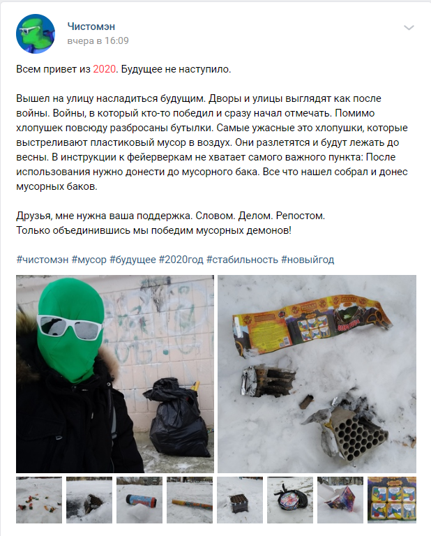 "Извини, Чистомэн, за то, что пост вышел без указания авторства. Но я очень рад, что на него обратило внимание так много людей, в том числе и СМИ. Ведь обычно неубранный мусор мало кого интересует. Друзья, уже от себя лично я призываю обращать внимание на то, что нас окружает, и всегда убирать за собой мусор!" - добавил глава комитета.