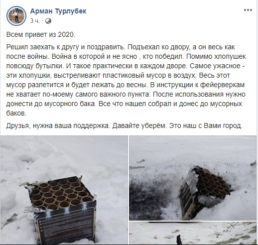 "Чиновник из Казахстана украл мой сегодняшний пост. Арман Турлубек, председатель Комитета по водным ресурсам Министерства экологии Казахстана, опубликовал в своем Facebook и Instagram пост, в котором рассказал, как он очищает дворы от фейерверков. Но почему-то использовал мой текст и мои фото. Сказать, что я удивлен, это ничего не сказать. Больше всего меня возмущает не сам факт воровства авторского контента, а тот факт, что чиновники такого уровня делают такие стыдные вещи в 2020 году", - написал Матис-Сиразеев.