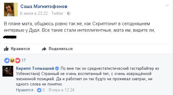 Пока Скриптонит никак не ответил на выпады Толмацкого в Сети. Зато вскоре в Twitter высказался Василий Вакуленко (Баста).