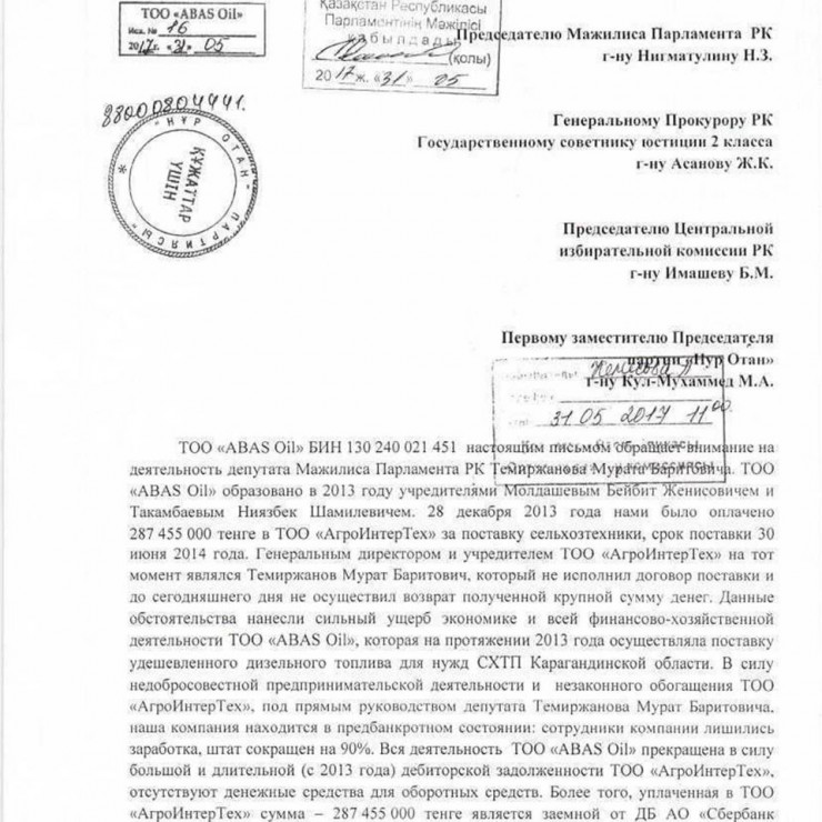В размещенном документе сообщается, что Темиржанов, будучи гендиректором ТОО "АгроИнтерТех", в 2013 году якобы получил 287 миллионов тенге от компании ТОО ABAS oil, которой руководил Такамбаев.