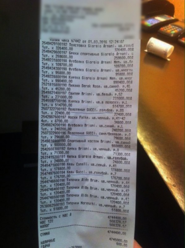 Отметим, что в социальных сетях бурно обсуждается чек из люксового магазина Алматы. Согласно фискальному документу - покупатель совершил за один раз покупку одежды почти на пять миллионов тенге. В частности, в списке значатся полотенце Gucci за 29 600 тенге, тапочки за 120 400 тенге , футболка Armani за 95 тысяч тенге и прочие мужские принадлежности.
