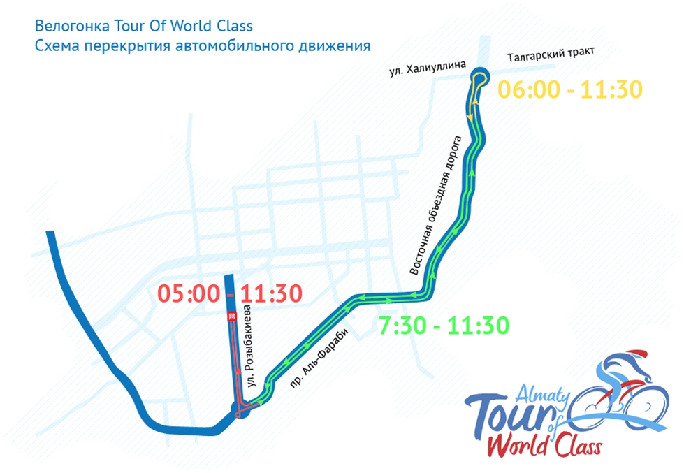 Велогонка для любителей Tour Of World Class Almaty состоится в субботу, 16 августа. В связи с проведением соревнований с 5.00 до 11.30 движение автотранспорта будет частично перекрыто в обоих направлениях на отрезках улиц Розыбакиева - Левитана до проспекта Аль-Фараби, проспект Аль-Фараби от пересечения с улицей Розыбакиева до проспекта Достык, а также Восточная объездная автомобильная дорога до развязки на пересечении улиц Халиуллина - Талгарский тракт - Кульджинский тракт.