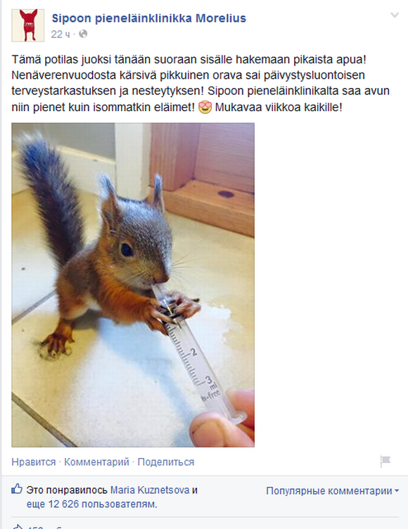 Как рассказал ветеринар, рыжий малыш был усталым и истощенным, однако после того, как его напоили из шприца и дали еды, он почувствовал себя значительно лучше. Бельчонка оставили в клинике поправить здоровье. По словам Хейсканена, скорее всего, детеныш выпал из гнезда, и, к счастью, ему хватило смекалки обратиться за помощью к людям. Отметим, что фото бельчонка, опубликованное на странице ветеринарной клиники в социальной сети Facebook, собрало шквал  "лайков" от пользователей.