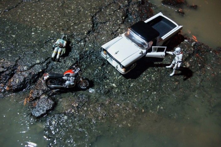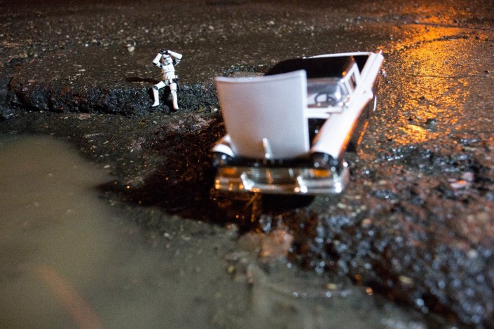 Вторая часть проекта называется "Проблемы у штурмовика". На них авторы сфотографировали фигурки имперского штурмовика и наемника Боба Фетта из "Звездных войн", а также игрушечный автомобиль. На снимках инсценировано ДТП.