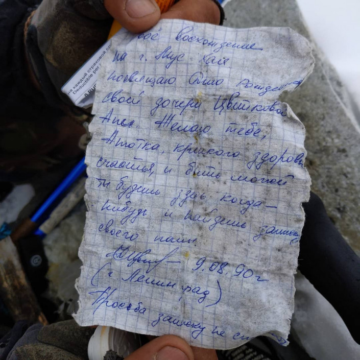 "Свое восхождение на гору Муус Хайа посвящаю дню рождения своей дочери Цветковой Ани. Желаю тебе, Анютка, крепкого здоровья, счастья, и, быть может, ты будешь здесь когда-нибудь и найдешь записку своего папы. 9.08.90 г. (г. Ленинград)", - говорится в послании, написанном на тетрадном листочке.
