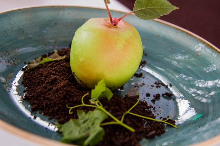 "Оболочка этого десерта выполнена из творога, внутри - карамелизированное яблоко и бисквит. Листок - от настоящей яблони, "земля" - это печенье с шоколадом", - описал придуманный им десерт шеф-повар ресторанов "Абай" и "Инжу" Александр Суворов.