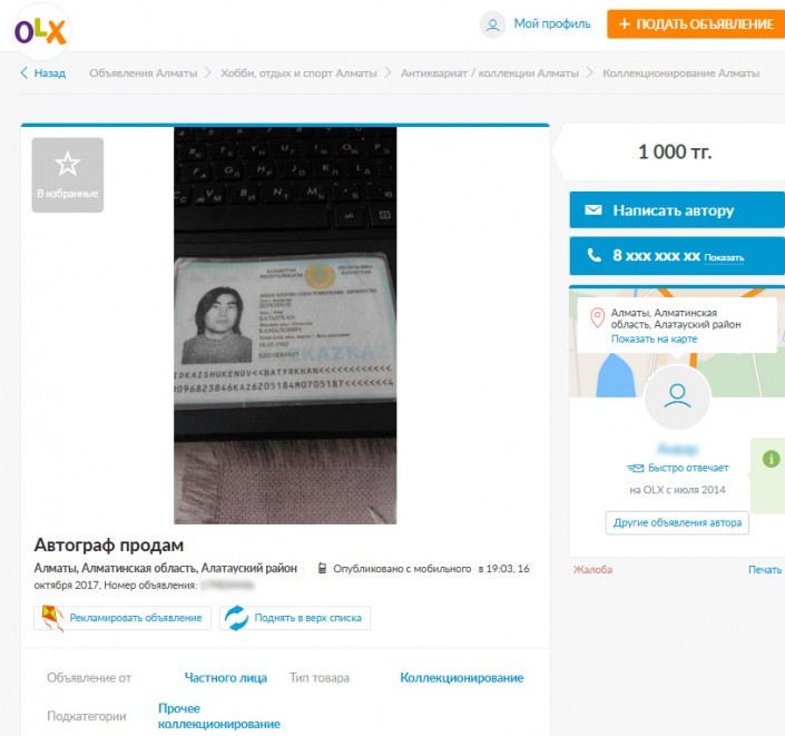 Житель Алматы продает в Интернете якобы подлинное удостоверение личности Батырхана Шукенова, сообщает Tengrinews.kz. Объявление размещено на сайте OLX.