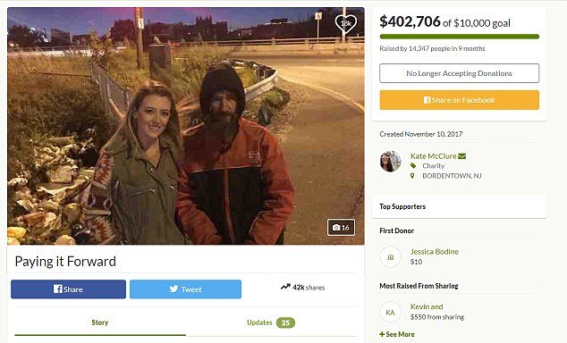 35-летнего отставного военного, оставшегося бездомным, стали называть "добрым самаритянином". В знак благодарности Кейт МакКлюр (та самая девушка) и ее парень Марк Д’Амико запустили кампанию на сайте GoFundMe по сбору средств для мужчины. Около 15 тысяч человек пожертвовали для него деньги, собрав за несколько недель больше 400 тысяч долларов.