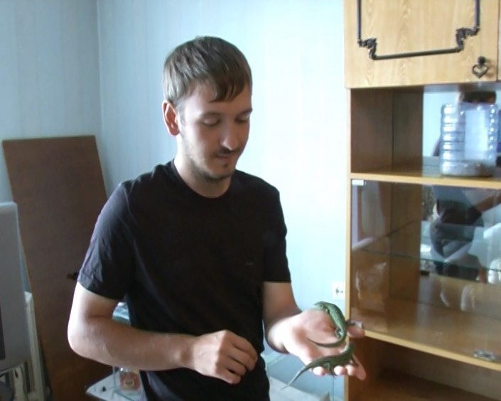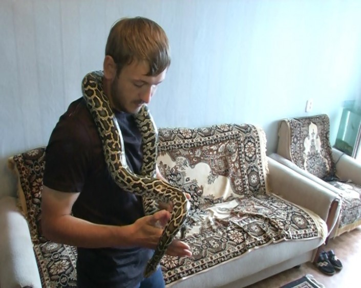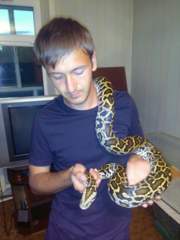 Андрей Селютин, которому 21 год, начал увлекаться редкими питомцами с 2010 года. Сначала парень взял домой аквариум и несколько рыбок, а затем попугая, ежика, хомячков и ящериц. Ну а позже, в прошлом году, он нашел своего любимца, тигрового питона, которого купил за 55 тысяч тенге и привез из Актау.