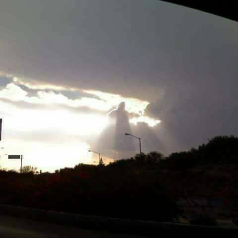 Странное сочетание облаков и света образовало уходящую в небо светящуюся фигуру, напоминающую раскинутые в стороны руки человека. Очевидцы записали момент на видео и сделали несколько фото.
