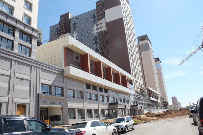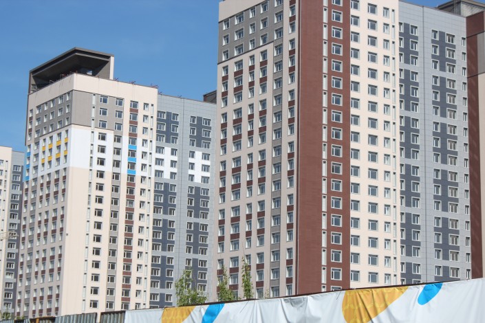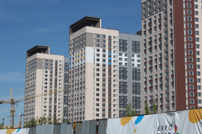 Фасады Highvill Park, строящегося недалеко от стадиона "Астана Арена", начали перекрашивать в белый, синий и желтый цвета.