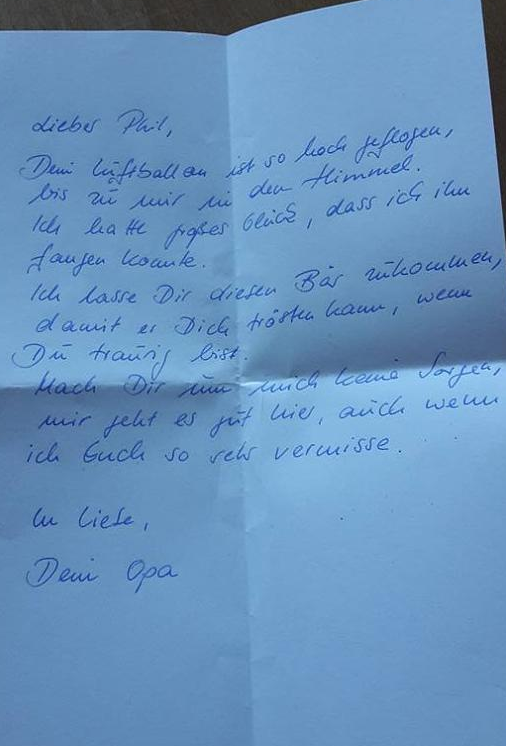 "Мой дорогой Фил! Твой воздушный шарик улетел настолько высоко, что очень быстро достиг неба и я смог его прочитать. Я рад, что у тебя все в порядке. Прими в подарок этого плюшевого мишку, который сможет утешить тебя, когда тебе станет грустно, - говорилось в письме. - С любовью, твой дедушка".