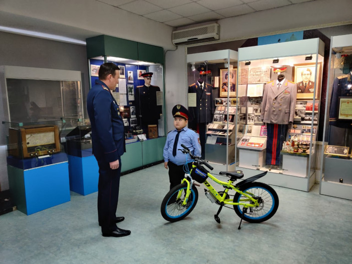 Маленький "полицейский" получил в подарок от министра внутренних дел Ерлана Тургумбаева велосипед, передает Tengrinews.kz.