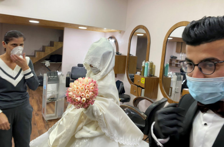 Палестиналық қалыңдық пен күйеу жігіт беттеріне маска тағып, қолына қолғап тағып шыққан.