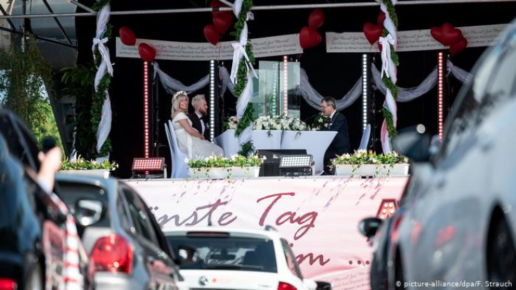 Германиялық Янине және Филип Щольцтың неке қию рәсімі автокинотеатрда өткен. Сахнада ақ дастарханның үстінде неке қию рәсімін өткізіп жатқан жастарды құттықтауға келген қонақтар оларды көлікте отырып тамашалаған.
