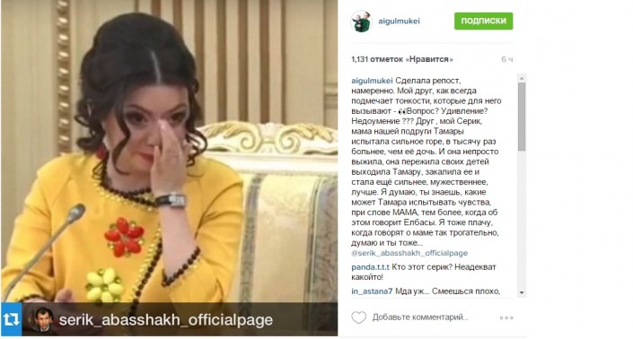 "Сделала репост намеренно. Мой друг, как всегда, подмечает тонкости (...). Друг мой, Серик, мама нашей подруги Тамары испытала сильное горе, в тысячу раз больнее, чем ее дочь. И она не просто выжила, она пережила своих детей, выходила Тамару, закалила ее и стала еще сильнее, мужественнее, лучше. Я думаю, ты знаешь, какие может Тамара испытывать чувства при слове "МАМА", тем более, когда об этом говорит Елбасы. Я тоже плачу, когда говорят о маме так трогательно, думаю и ты тоже..." - написала в Instagram Мукей.
