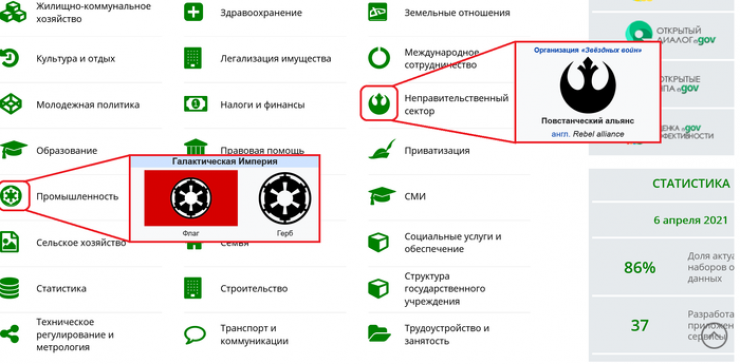 Схожесть иконок с гербами из "Звездных войн" заметил пользователь Twitter с ником @Utebaliyev. Иконка к разделу "Промышленность" очень напоминает "имперский герб" - символ Галактической империи Шива Палпатина, а иконка к разделу "Неправительственный сектор" похожа на герб Повстанческого альянса - всегалактической военно-политической организации, боровшейся против Империи.