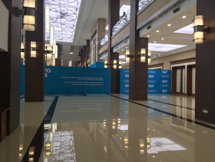 Журналистов во Дворец независимости пускают через боковой вход, а члены Нацсовета проходят через главные двери. Блоки с надписью Ulttyq Kenes отделили участников заседания от журналистов.